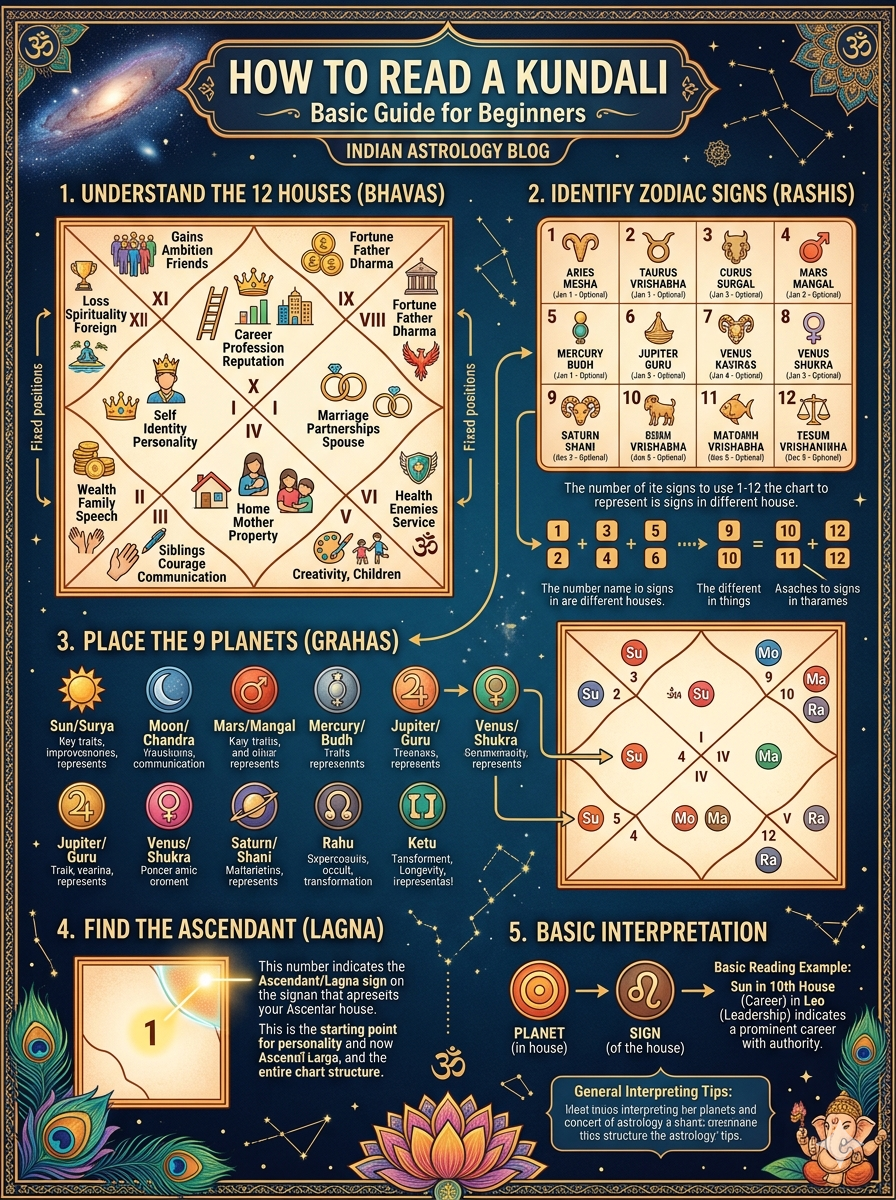 Learning how to read Kundli helps you move from generic astrology content to a more structured understanding of your own chart, your Lagna Kundali, and your long-term life patterns.
